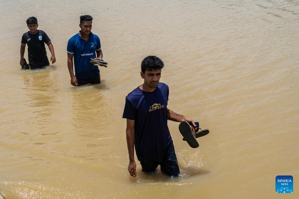 People wade through floodwater on a road in Feni, Bangladesh, July 11, 2025. As the monsoon sets in and rainfall continues, flooding has occurred in parts of Feni. (Xinhua)