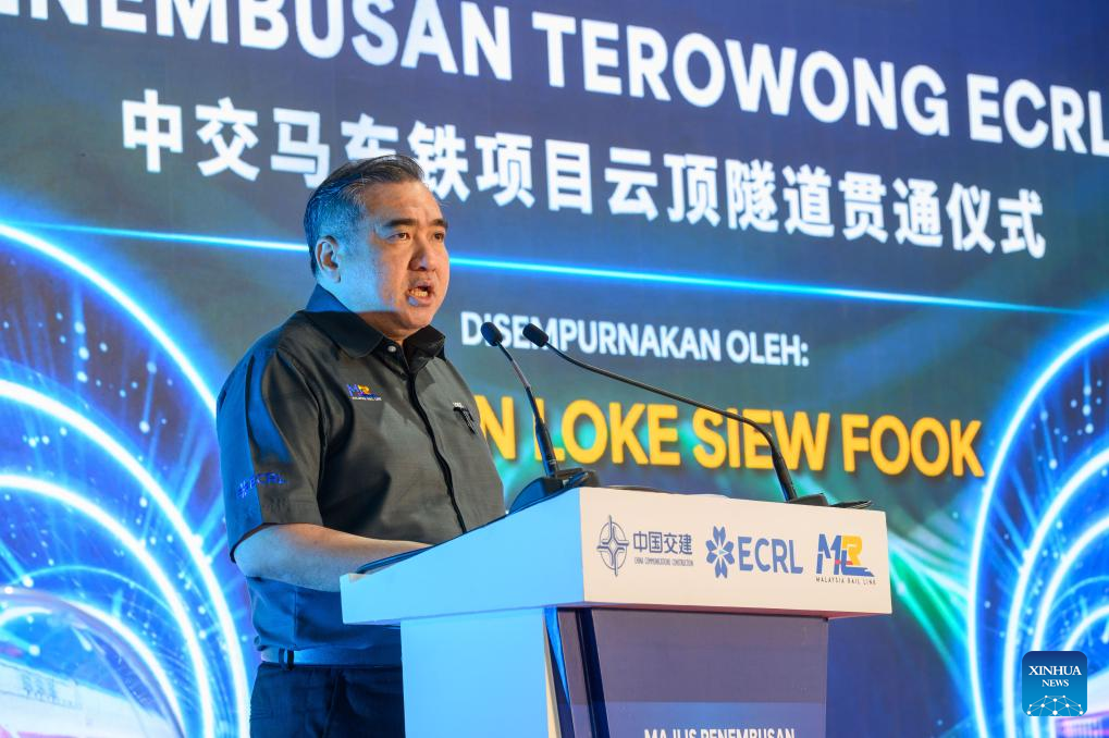 Malaysian Transport Minister Anthony Loke Siew Fook speaks during a ceremony marking the breakthrough of the 16.39-kilometer Genting Tunnel of the East Coast Rail Link (ECRL) in Pahang state, Malaysia, July 12, 2025. The East Coast Rail Link (ECRL), a mega rail project in Malaysia being built by the China Communications Construction Company (CCCC), marked another key milestone on Saturday with the breakthrough of the 16.39-kilometer Genting Tunnel. The breakthrough represents a significant achievement in itself, situated beneath more than 750 meters of mountainous terrain, the company said in a statement following a ceremony to mark the occasion.(Photo by Chong Voon Chung/Xinhua)