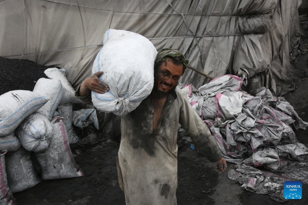A laborer carries coal at a local market in Kabul, Afghanistan, July 13, 2025. (Photo by Saifurahman Safi/Xinhua)