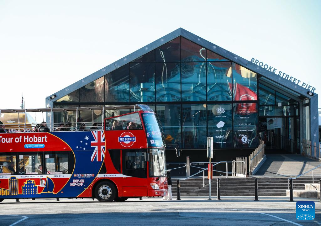 A sightseeing bus parked by the Brooke Street Pier is pictured in Hobart, Australia, on July 16, 2025. Located in Tasmania's southeast on the estuary of the River Derwent, Hobart is Australia's southernmost capital city. It serves as Tasmania's financial and administrative hub, as well as major port and tourist destination. (Xinhua/Ma Ping)