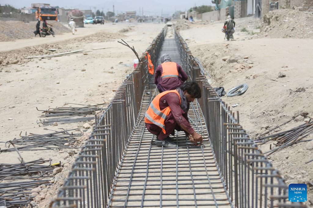Afghan laborers build a road construction project in Kabul, Afghanistan, July 23, 2025. The Afghan interim government's national procurement commission has approved six new development projects worth 828 million afghani (about 12 million U.S. dollars), according to an official statement released Tuesday. (Photo by Saifurahman Safi/Xinhua)
