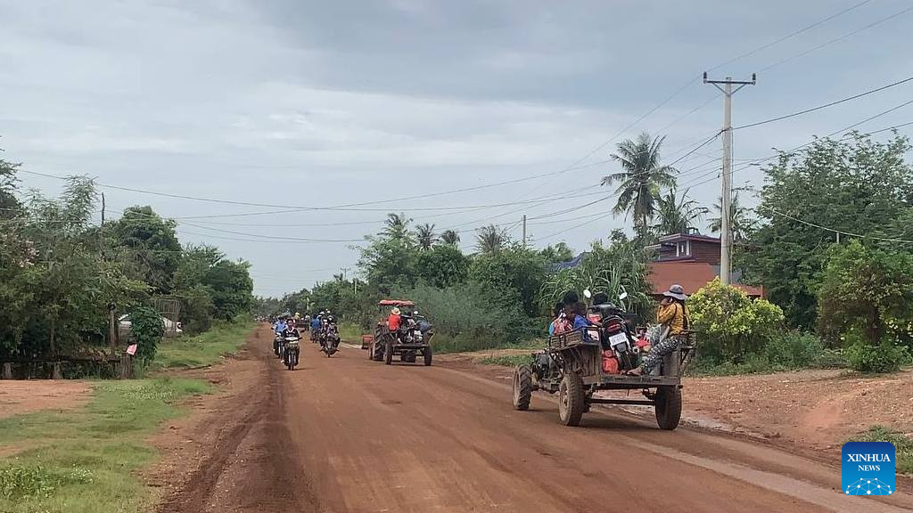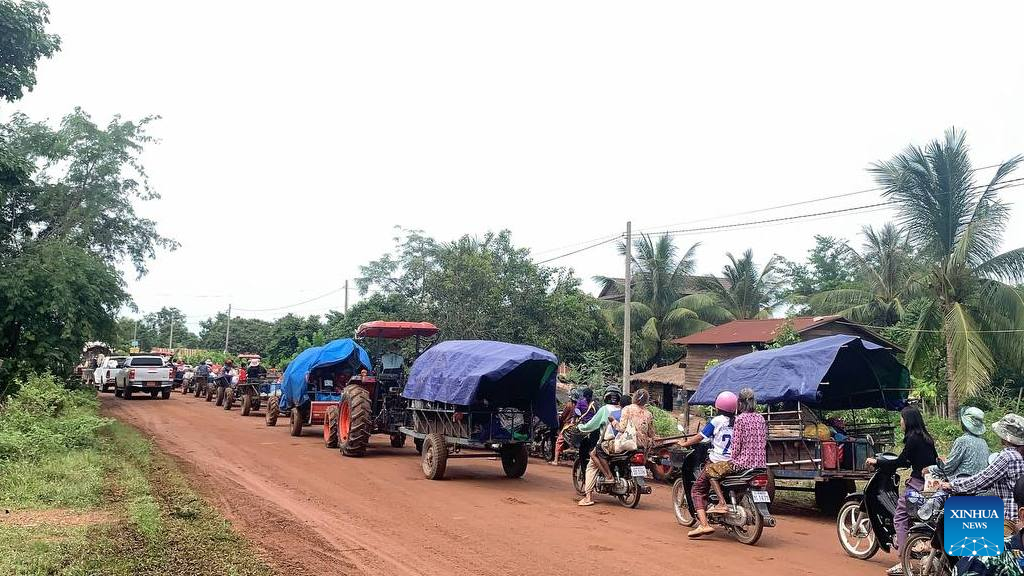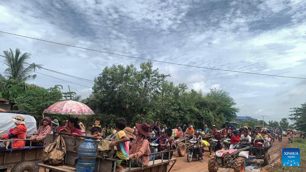 Residents evacuate from the Thailand-Cambodia border area in Oddar Meanchey province, Cambodia on July 24, 2025. Cambodian Prime Minister Hun Manet on Thursday called on the people to stay calm and trust the government and armed forces amid a border clash with Thailand. In a post on his official social media platforms, Hun Manet said the Thai army launched on Thursday morning an attack on Cambodian army positions in Oddar Meanchey province, and expanded the geographical area of their attack to Preah Vihear province. (Photo by Phal Lim/Xinhua)
