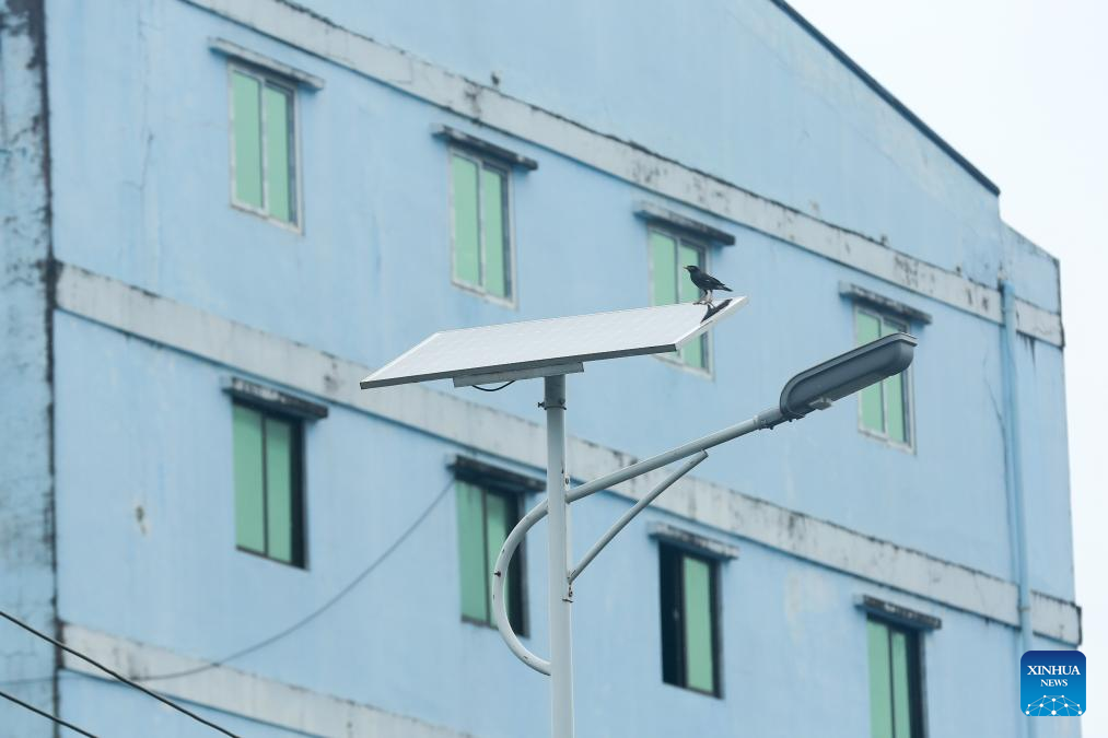 This photo taken on July 24, 2025 shows a solar-powered streetlight in Yangon, Myanmar. A donation ceremony for China-aided solar-powered streetlights was held in Yangon on Thursday.