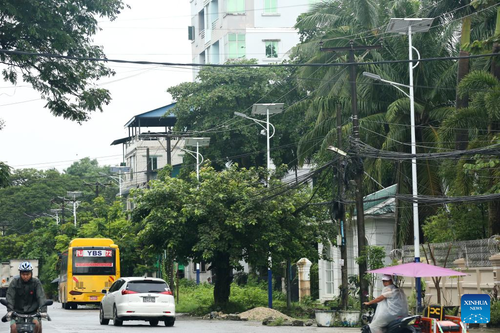 This photo taken on July 24, 2025 shows solar-powered streetlights along the street in Yangon, Myanmar. A donation ceremony for China-aided solar-powered streetlights was held in Yangon on Thursday. At the event, 40 solar streetlights, provided by the Yunnan Provincial People's Association for Friendship with Foreign Countries, were handed over to the chairman of the Thaketa township administration body. The donation aimed to improve night travel safety and reduce electricity costs. It also helped strengthen friendship between China and Myanmar. (Photo by Myo Kyaw Soe/Xinhua)