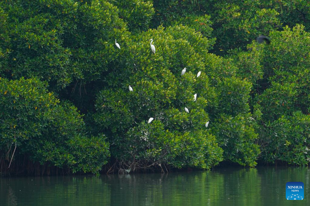 This photo taken on July 25, 2025 shows a view of mangroves with herons near the lagoon in Negombo, Sri Lanka. July 26 marks the International Day for the Conservation of the Mangrove Ecosystem. Sri Lanka's mangroves play an important role in purifying seawater, buffering coastal storms, sequestering carbon and sustaining biodiversity. (Photo by Thilina Kaluthotage/Xinhua)