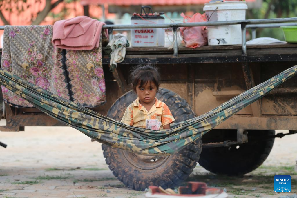 A little girl, who fled with her family from the border in Oddar Meanchey province, sits on a hammock at a refuge in Siem Reap province, Cambodia, July 25, 2025. At least 13 Cambodian people died and 71 others were injured in border clashes with Thailand, a Cambodian defense spokesperson said Saturday. According to Thai media, the border clashes started for the third day on Saturday morning after the Cambodian side opened fire against Thai troops. (Photo by Sao Khuth/Xinhua)