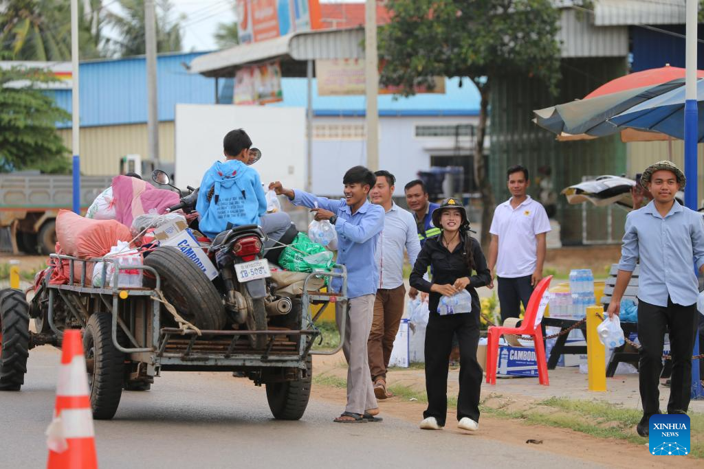 Cambodian villagers from Oddar Meanchey province receive drinking water after fleeing their homes to seek refuge in Siem Reap province, Cambodia, July 25, 2025. At least 13 Cambodian people died and 71 others were injured in border clashes with Thailand, a Cambodian defense spokesperson said Saturday. According to Thai media, the border clashes started for the third day on Saturday morning after the Cambodian side opened fire against Thai troops. (Photo by Sao Khuth/Xinhua)