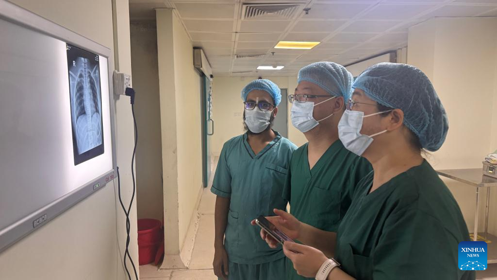 Liu Shuhua (R), leader of the Chinese medical team, and two colleagues take a chest X-ray for a patient ahead of a surgery at the Bangladesh Institute of Burns and Plastic Surgery in Dhaka, Bangladesh, July 26, 2025. (Xinhua)