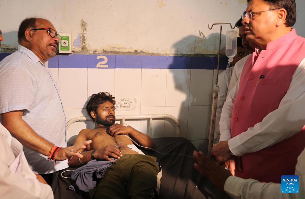 Uttarakhand Chief Minister Pushkar Singh Dhami (R) visits an injured person at a hospital after a stampede at Mansa Devi temple in Haridwar district, northern India's Uttarakhand state, July 27, 2025. At least six people were killed and 29 others injured Sunday in a stampede at a Hindu temple in the northern Indian state of Uttarakhand, police said. The stampede broke out at Mansa Devi temple in Haridwar district, about 53 km south of Dehradun, the capital city of Uttarakhand. (UNI/Handout via Xinhua)