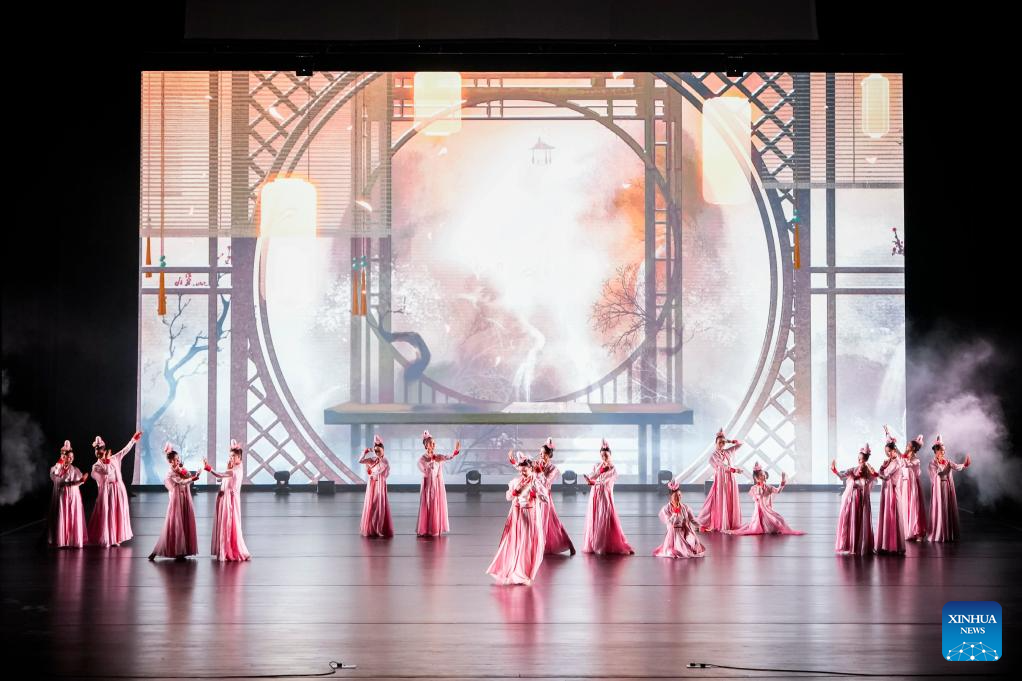 A performance is staged during a China-Russia cultural fair in Heihe, northeast China's Heilongjiang Province, July 26, 2025. The 15th edition of this cultural event kicked off here on Saturday with more than 40 activities in total, facilitating cultural exchanges and regional cooperation between the two countries. (Photo by Zhao Donglai/Xinhua)