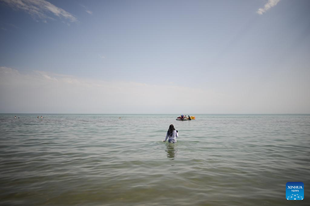 People visit the Kapchagay Reservoir in Konaev, Almaty region, Kazakhstan on July 26, 2025. Recently, the southern part of Kazakhstan, including the city of Almaty, Almaty region and South Kazakhstan region, has been hit by high heat waves. (Xinhua/Li Renzi)