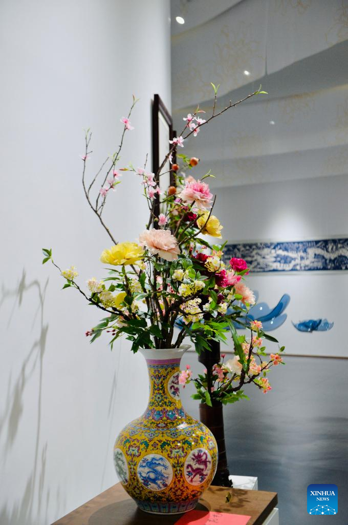 This photo taken on July 9, 2025 shows a peony-themed decoration displayed at a local company's exhibition hall in Heze City, east China's Shandong Province. (Xinhua/Cui Bowen)