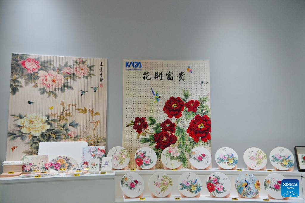 This photo taken on July 9, 2025 shows peony-themed decorations displayed at a local company's exhibition hall in Heze City, east China's Shandong Province. (Xinhua/Cui Bowen)