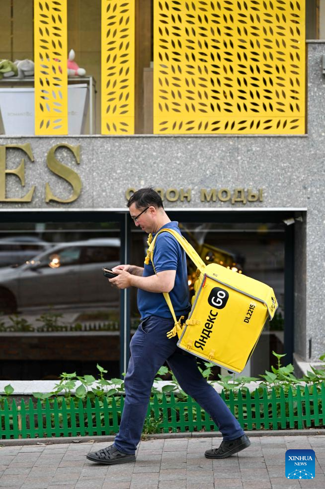 A delivery man is pictured on a street in Almaty, Kazakhstan, on Aug. 3, 2025. (Xinhua/Li Renzi)