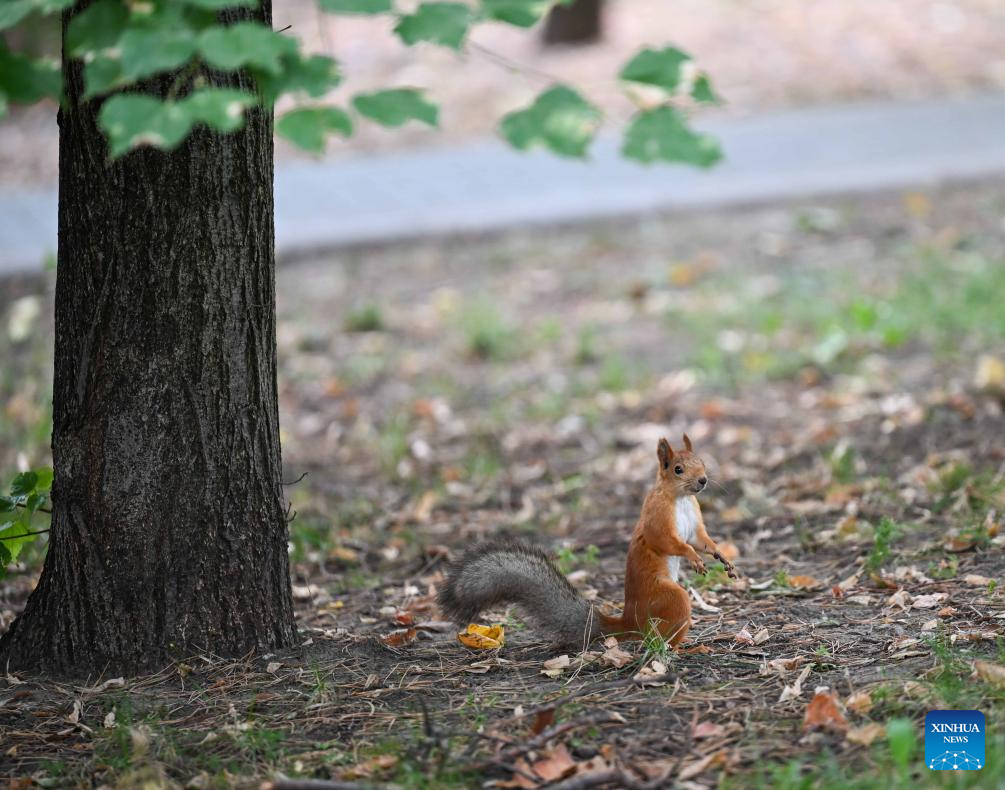 A squirrel is pictured at a park in Almaty, Kazakhstan, on Aug. 3, 2025. (Xinhua/Li Renzi)