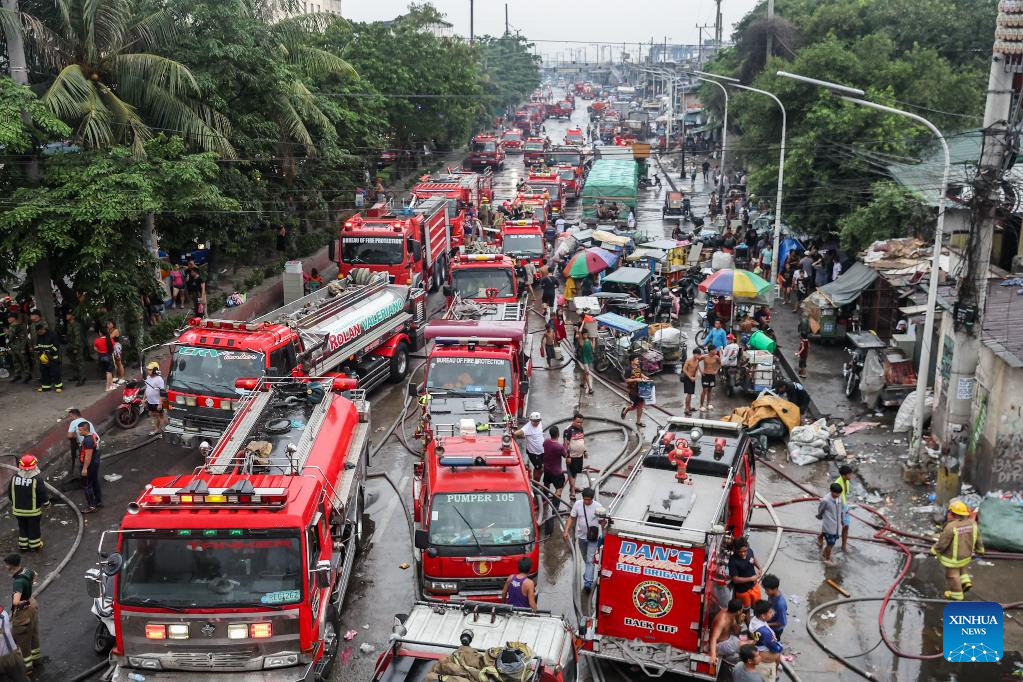 Fire trucks are seen at the site of a huge fire that hit a slum area in Manila, the Philippines, on Aug. 6, 2025. Around 1,500 families were affected by the fire according to the Philippine Bureau of Fire Protection. (Xinhua/Rouelle Umali)