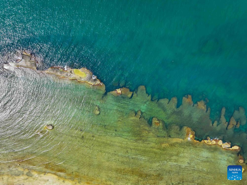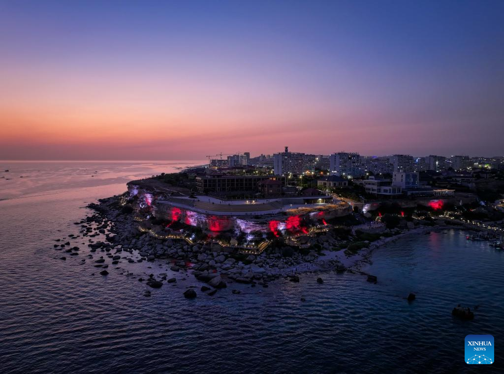 An aerial drone photo taken on Aug. 5, 2025 shows the Caspian Sea coast scenery in Aktau, Kazakhstan. (Xinhua/Li Renzi)