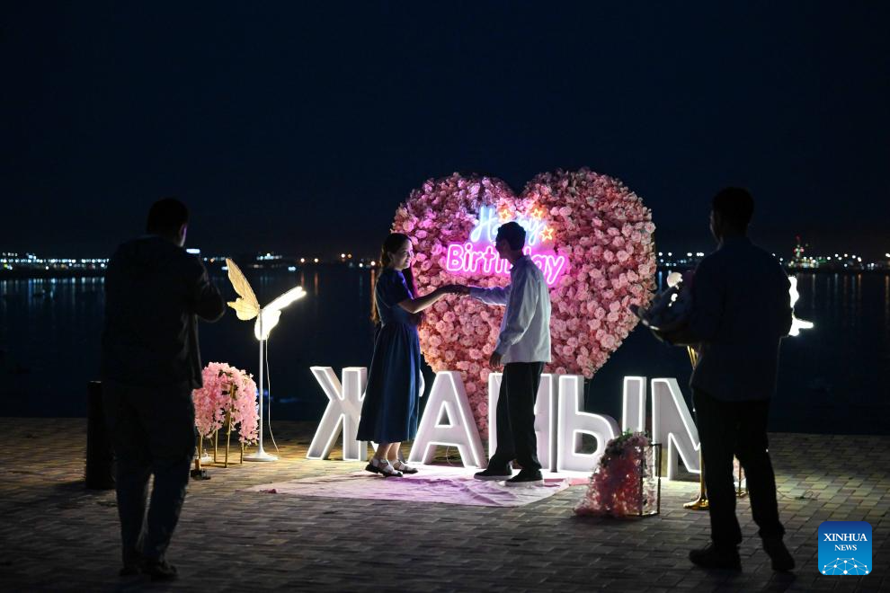 People celebrate birthday along the Caspian Sea in Aktau, Kazakhstan, on Aug. 5, 2025. (Xinhua/Li Renzi)