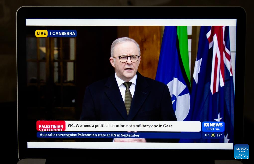CANBERRA, Aug. 11 (Xinhua) -- Australia will formally recognize a Palestinian state at the 80th session of the United Nations General Assembly in September, Prime Minister Anthony Albanese announced on Monday.