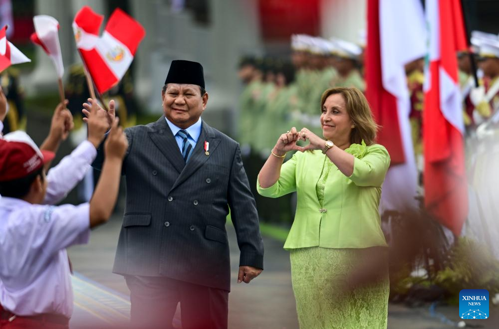 Indonesian President Prabowo Subianto (L) and Peruvian President Dina Boluarte gesture to students as they inspect the guard of honor during a welcome ceremony at Merdeka Palace in Jakarta, Indonesia, Aug. 11, 2025. (Xinhua/Zulkarnain)