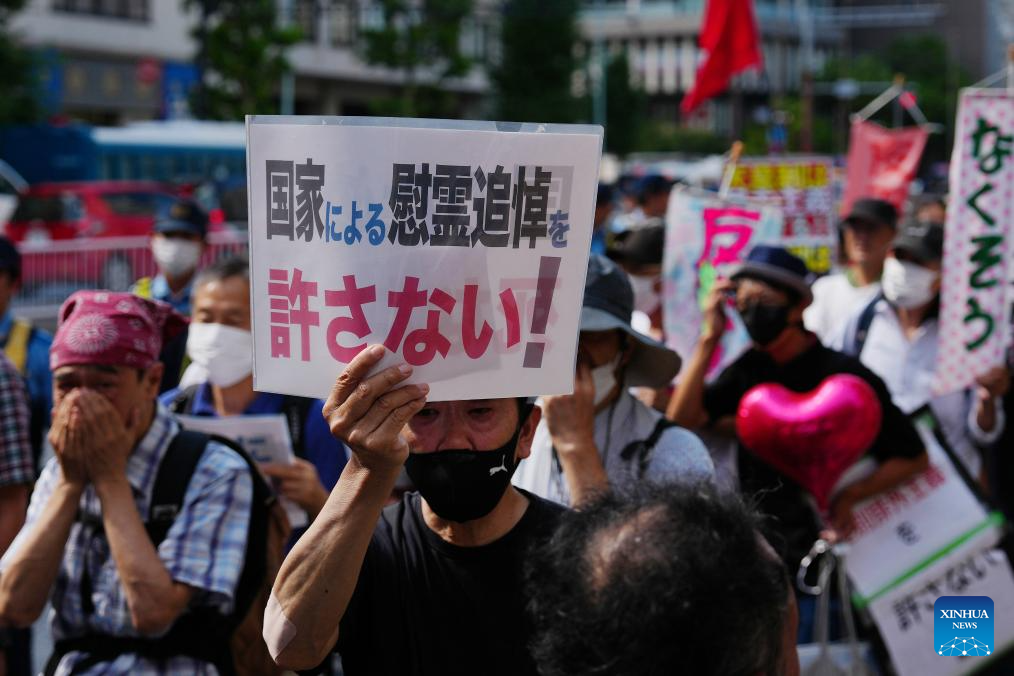 Participants are pictured during a demonstration on a street of Tokyo, Japan, on Aug. 15, 2025. Japanese Prime Minister Shigeru Ishiba on Friday expressed "remorse" in his speech at the annual memorial ceremony for the war dead, as the country marked the 80th anniversary of its unconditional surrender in World War II, but the "remorse" was not on Japan's responsibility for aggression against Asian countries.(Xinhua/Jia Haocheng)