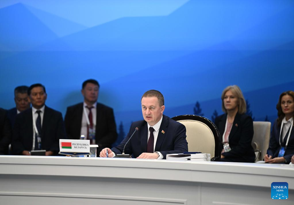 Belarusian Prime Minister Alexander Turchin (Front) speaks during an expanded session of the Eurasian Intergovernmental Council in Cholpon-Ata, Kyrgyzstan, on Aug. 15, 2025. The Eurasian Economic Union (EAEU) has grown into a major center of economic activity over the past decade, Kyrgyzstan's top government official said Friday. (Xinhua/Li Renzi)