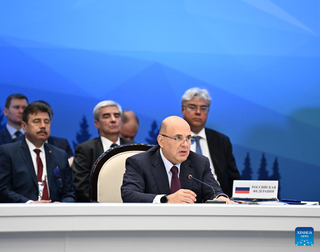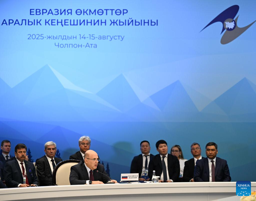Russian Prime Minister Mikhail Mishustin (Front) speaks during an expanded session of the Eurasian Intergovernmental Council in Cholpon-Ata, Kyrgyzstan, on Aug. 15, 2025. The Eurasian Economic Union (EAEU) has grown into a major center of economic activity over the past decade, Kyrgyzstan's top government official said Friday. (Xinhua/Li Renzi)