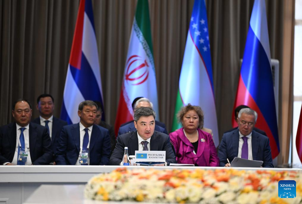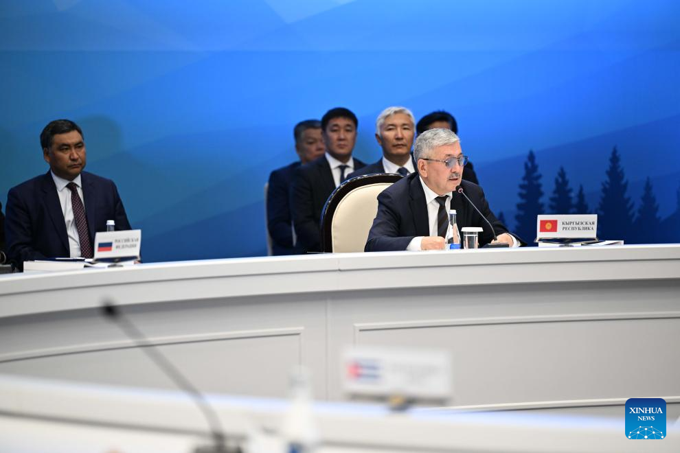Kazakh Prime Minister Olzhas Bektenov (Front) speaks during an expanded session of the Eurasian Intergovernmental Council in Cholpon-Ata, Kyrgyzstan, on Aug. 15, 2025. The Eurasian Economic Union (EAEU) has grown into a major center of economic activity over the past decade, Kyrgyzstan's top government official said Friday. (Xinhua/Li Renzi)