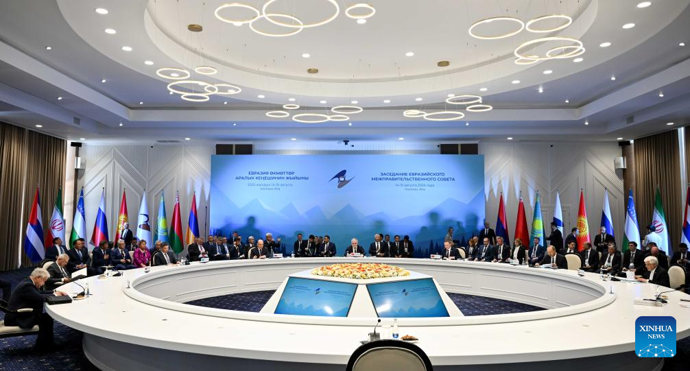 Representatives attend an expanded session of the Eurasian Intergovernmental Council in Cholpon-Ata, Kyrgyzstan, on Aug. 15, 2025. The Eurasian Economic Union (EAEU) has grown into a major center of economic activity over the past decade, Kyrgyzstan's top government official said Friday. (Xinhua/Li Renzi)