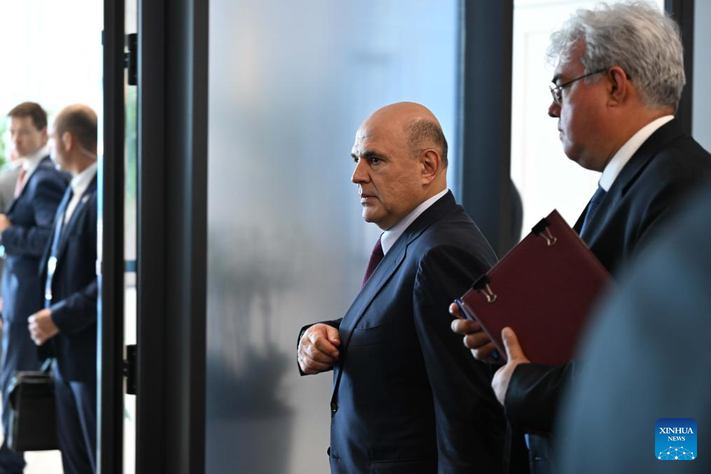 Russian Prime Minister Mikhail Mishustin (2nd R) leaves an expanded session of the Eurasian Intergovernmental Council in Cholpon-Ata, Kyrgyzstan, on Aug. 15, 2025. The Eurasian Economic Union (EAEU) has grown into a major center of economic activity over the past decade, Kyrgyzstan's top government official said Friday. (Xinhua/Li Renzi)