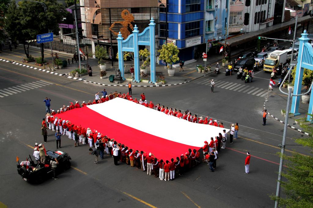 People hold Indonesia's national flag on a street during Indonesia's 80th Independence Day celebration in Surakarta, Central Java, Indonesia on Aug. 17, 2025.