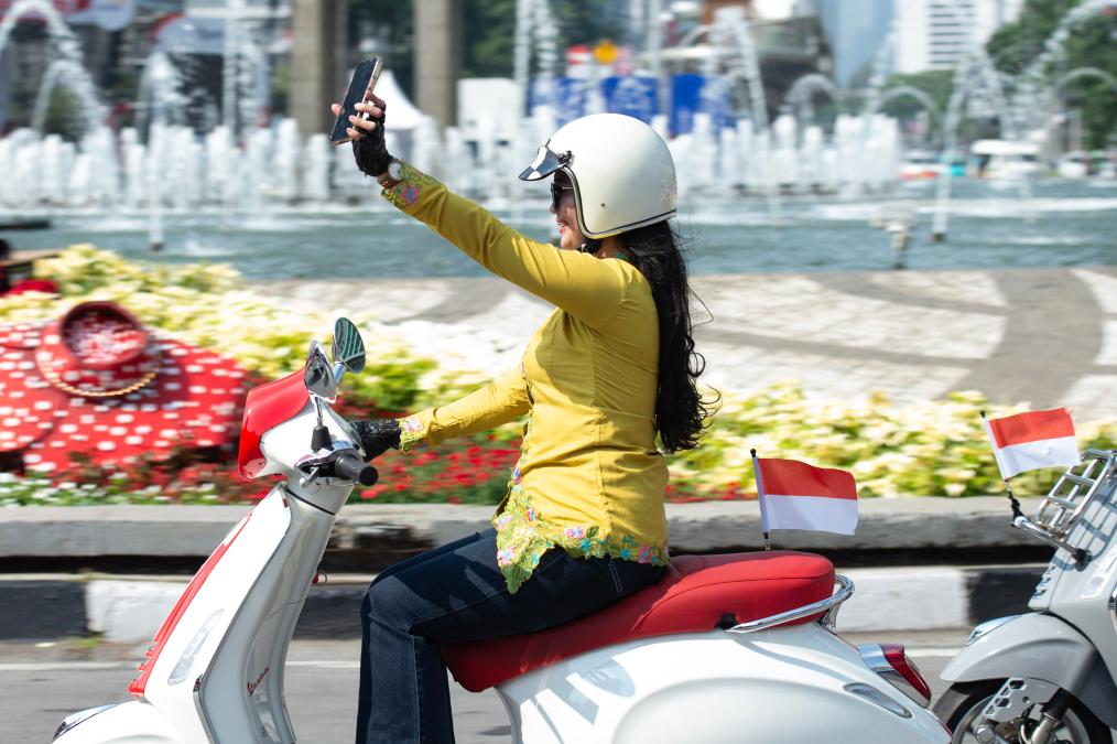 A woman riding a motorcycle takes a selfie during Indonesia's 80th Independence Day celebration in Jakarta, Indonesia on Aug. 17, 2025.