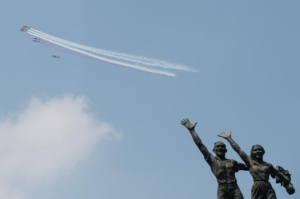 Indonesian Air Force fighter jets fly in the formation of number 80 during Indonesia's 80th Independence Day celebration in Jakarta, Indonesia on Aug. 17, 2025.