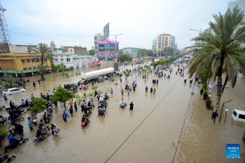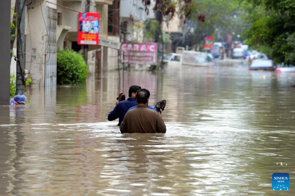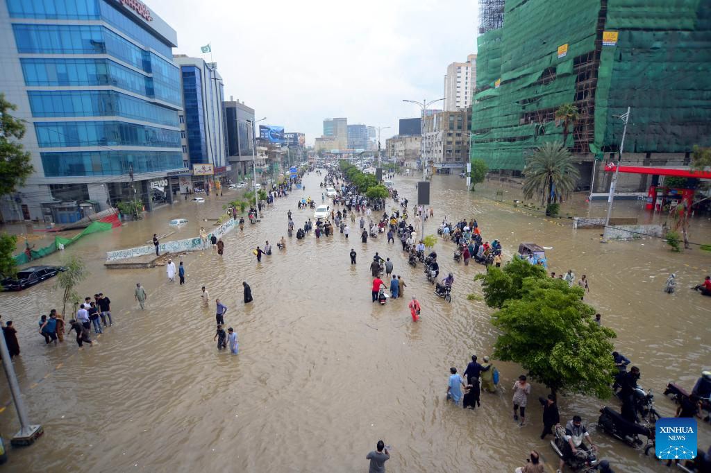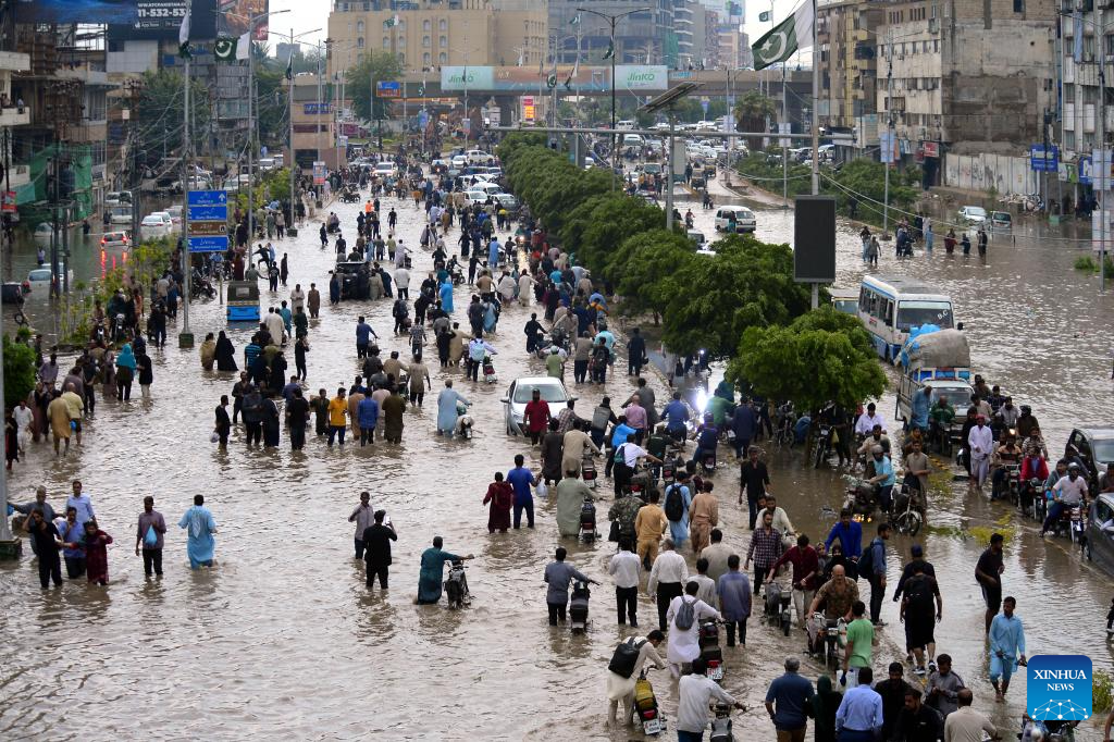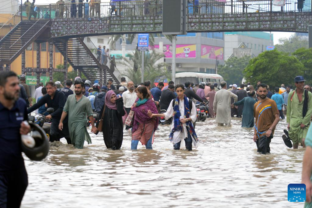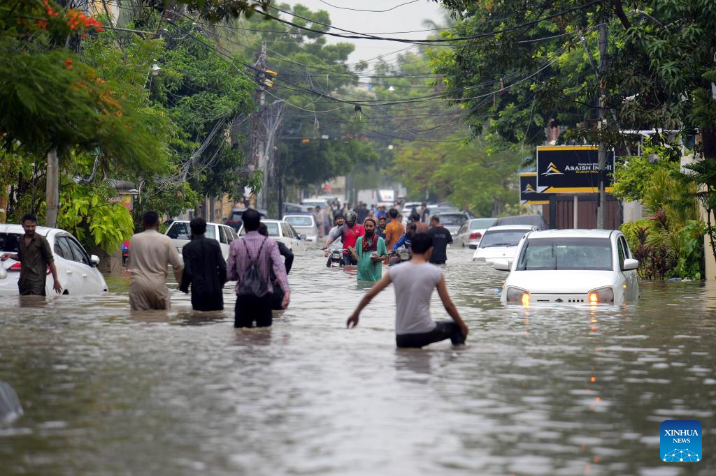 People wade through a flooded street after heavy monsoon rain in Karachi, Pakistan, on Aug. 19, 2025. (Str/Xinhua)