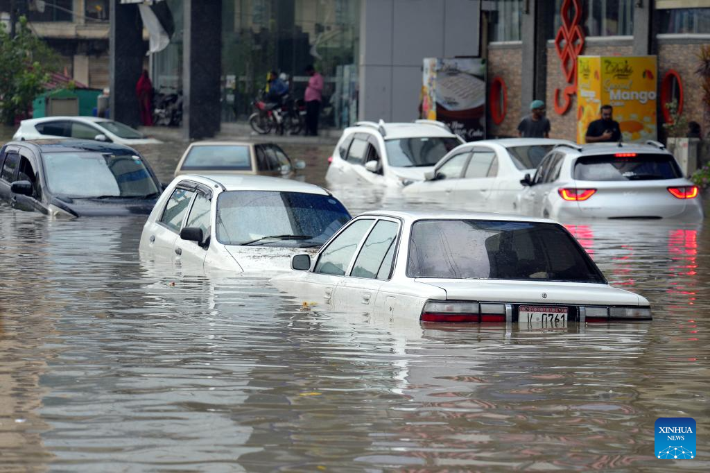 Vehicles are immersed in water after heavy monsoon rain in Karachi, Pakistan, on Aug. 19, 2025. (Str/Xinhua)
