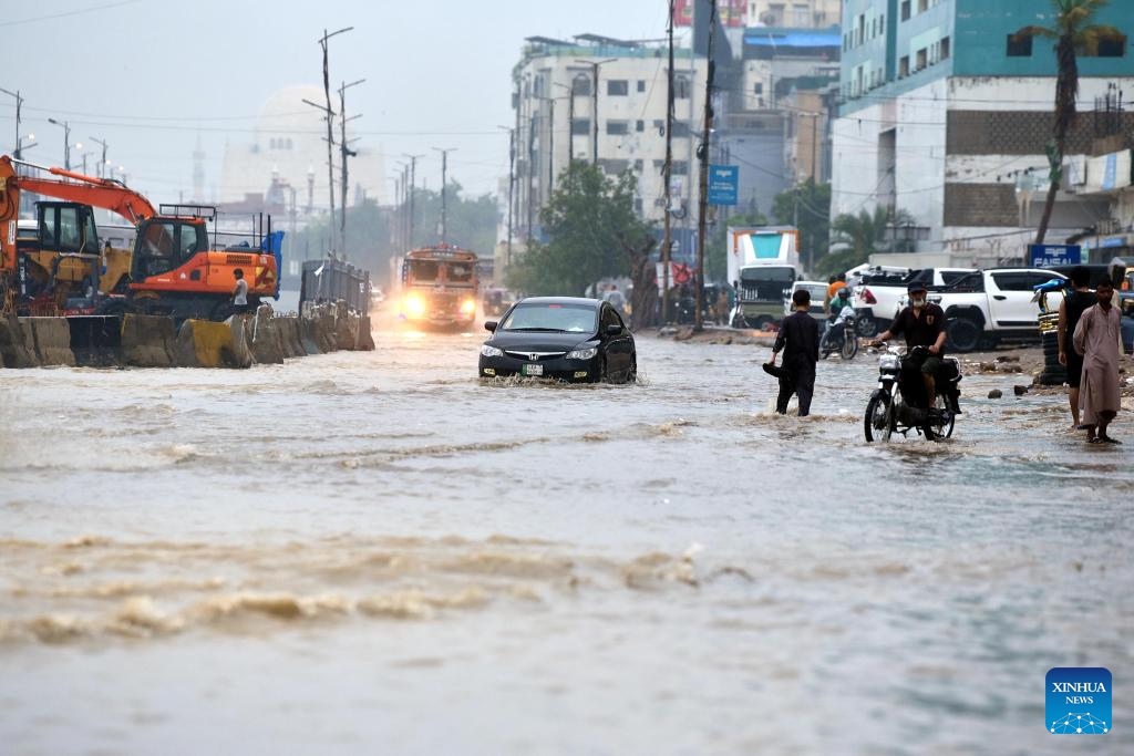 Vehicles run through a flooded street after heavy monsoon rain in Karachi, Pakistan, on Aug. 19, 2025. (Str/Xinhua)