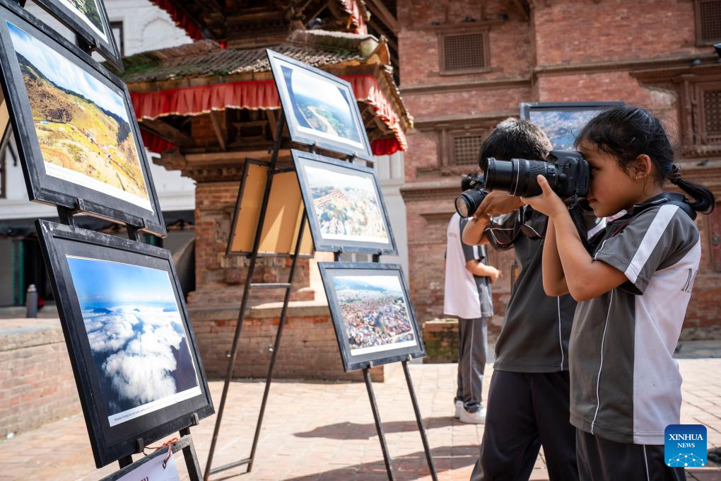 Students visit and take photos at a photo exhibition held to mark the World Photography Day in Kathmandu, Nepal, Aug. 19, 2025. (Photo by Hari Maharjan/Xinhua)