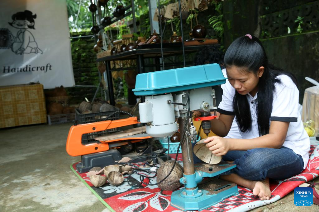 Coconut shell-based handicrafts are pictured at a workshop in Yangon, Myanmar, Aug. 19, 2025. (Xinhua/Myo Kyaw Soe)