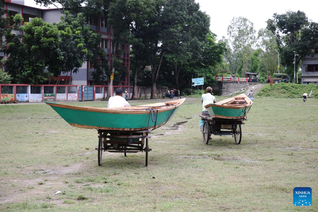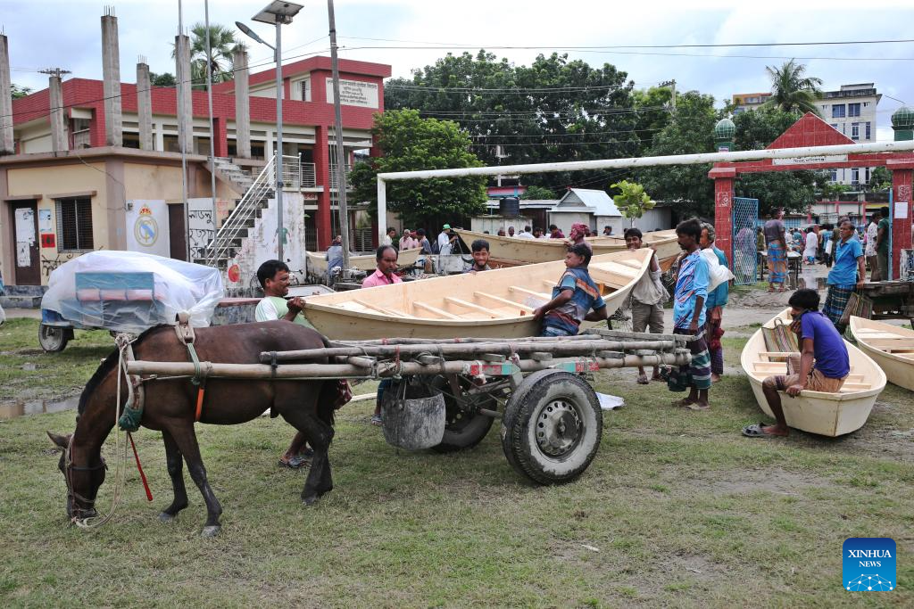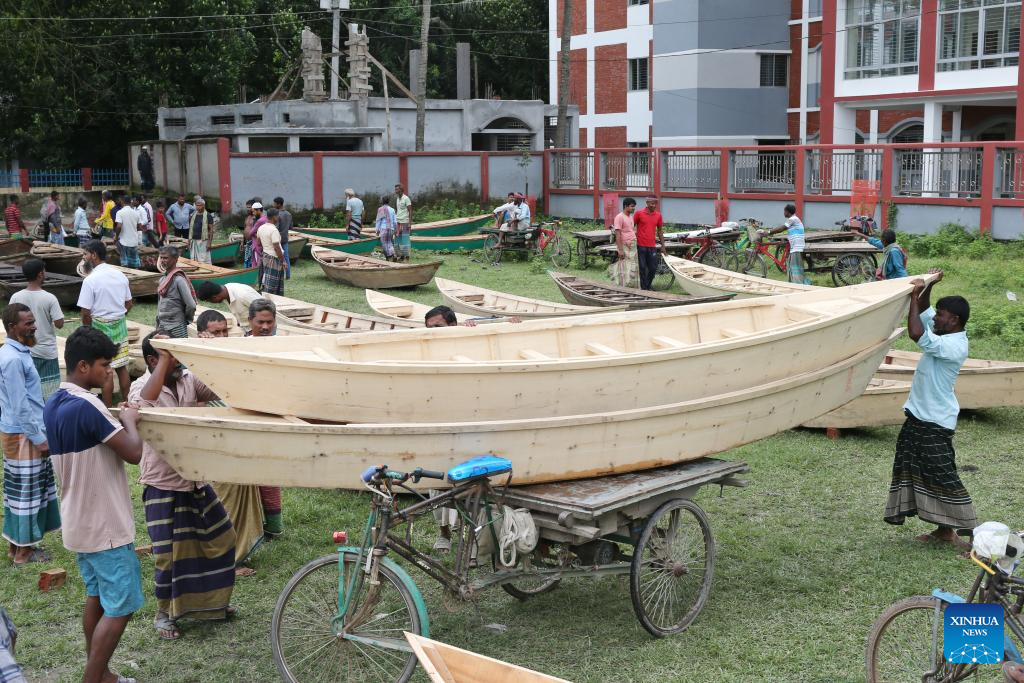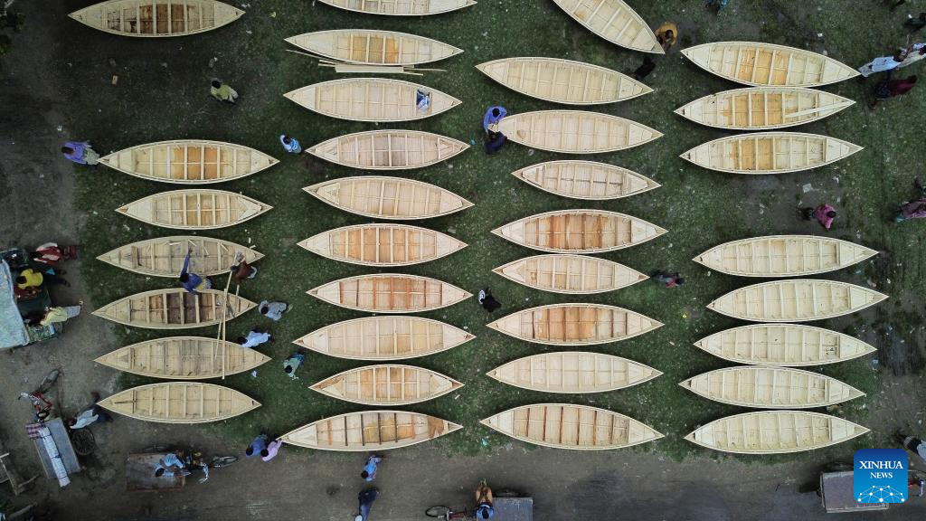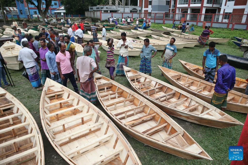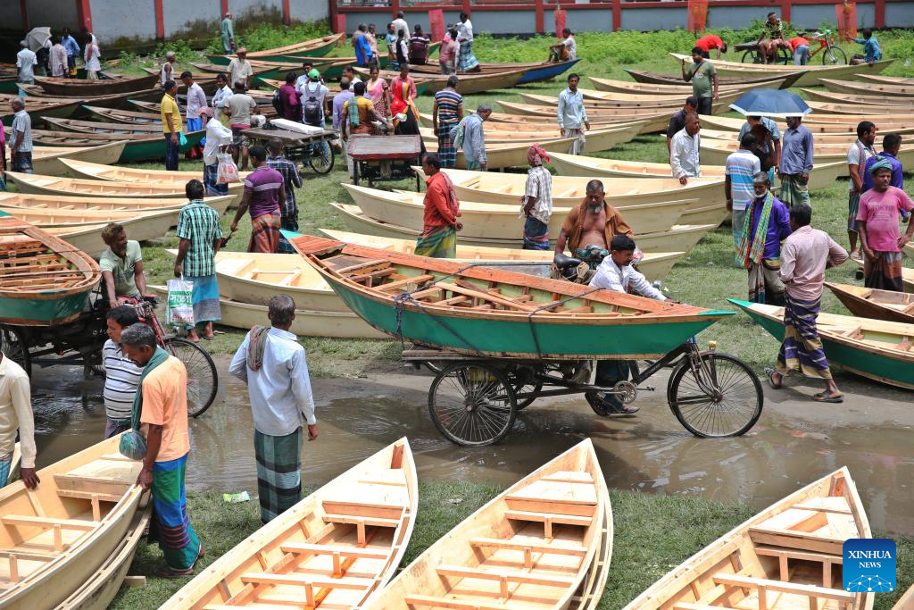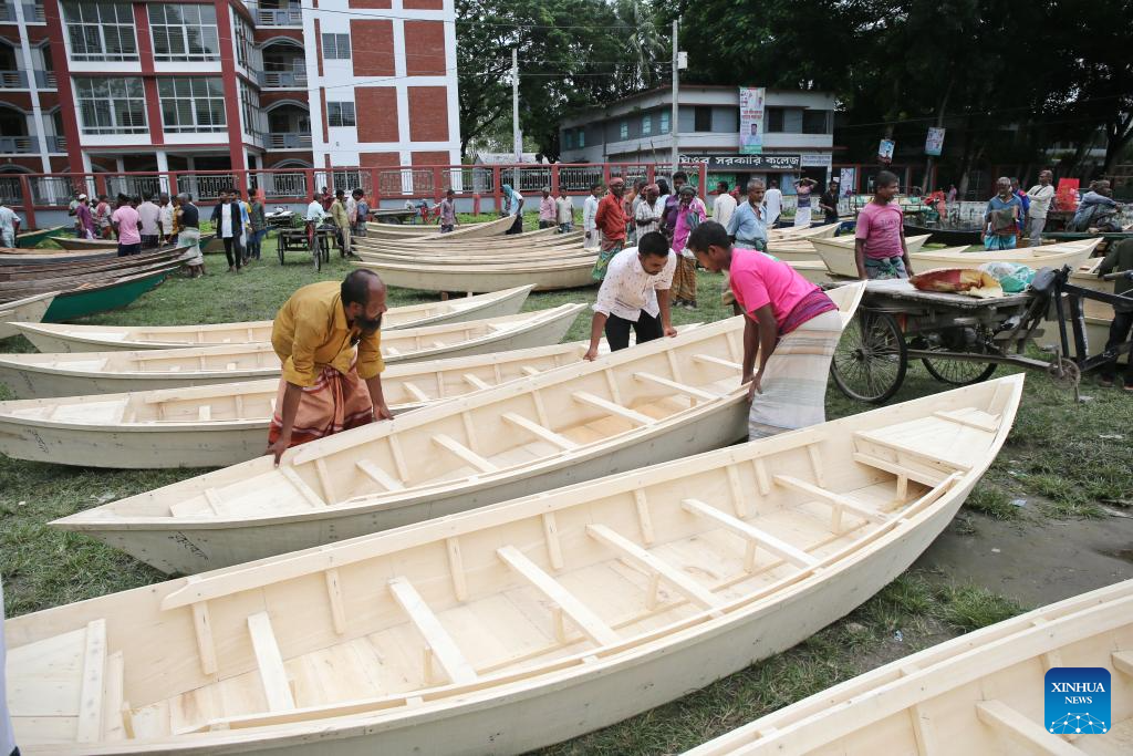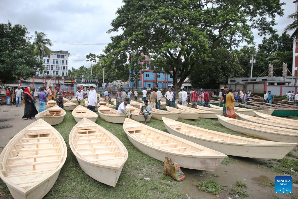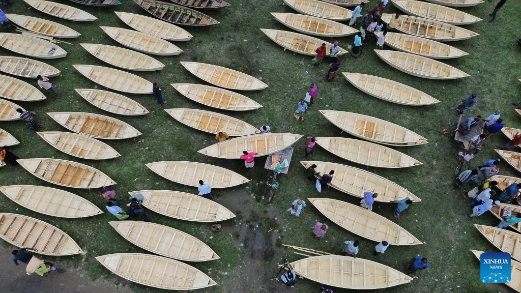People transport hand-made wooden boats at a traditional market in Manikganj, Bangladesh, on Aug. 20, 2025. Waterways play a vital role in communications in Bangladesh, where traditional country boats and small vessels continue to offer affordable and convenient transport. (Photo by Habibur Rahman/Xinhua)