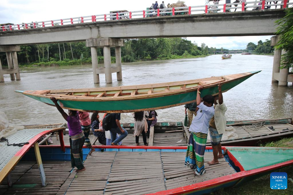 People transport a hand-made wooden boat in Manikganj, Bangladesh, on Aug. 20, 2025. Waterways play a vital role in communications in Bangladesh, where traditional country boats and small vessels continue to offer affordable and convenient transport. (Photo by Habibur Rahman/Xinhua)