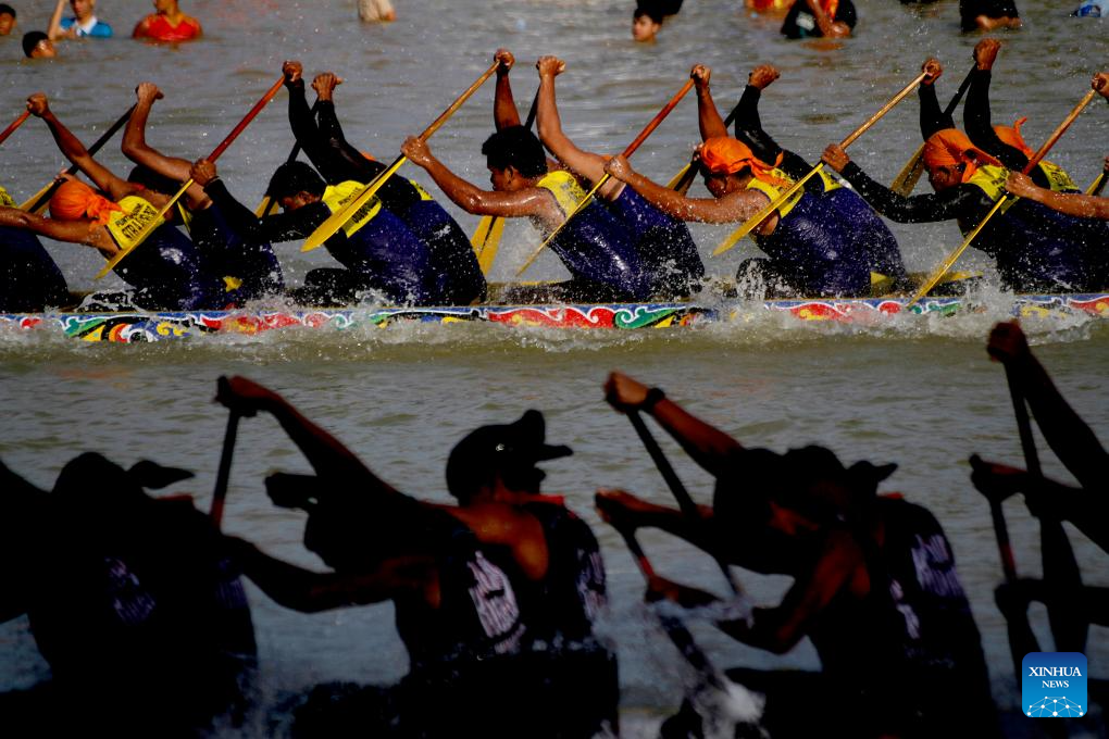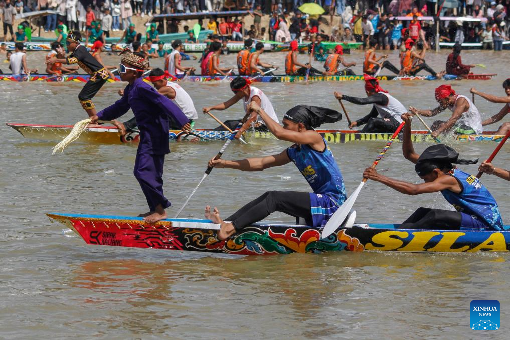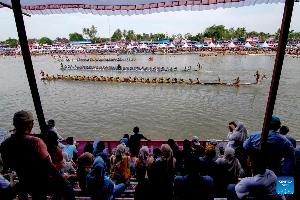 People participate in a traditional long boat race or well known as Pacu Jalur during Pacu Jalur Festival at Kuantan Batang river in Kuantan Singingi Regency, Riau Province, Indonesia, on Aug. 21, 2025. Pacu Jalur Festival is observed here from Aug. 20 to Aug. 24. (Photo by Hadly Vavaldi/Xinhua)