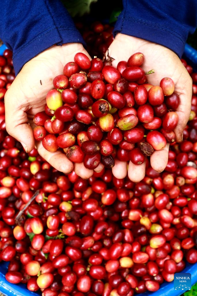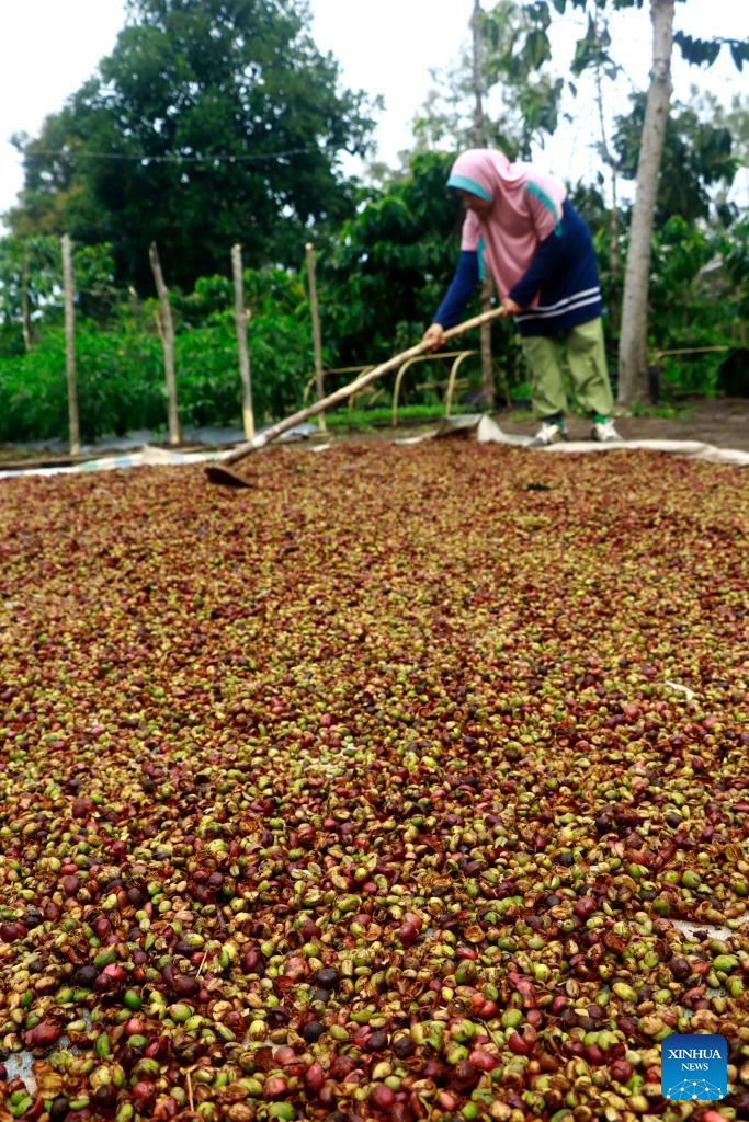 A farmer dries red cherries of robusta coffee beans at a plantation in Bener Meriah regency, Aceh province, Indonesia, on Aug. 24, 2025. (Photo by Yulham/Xinhua)