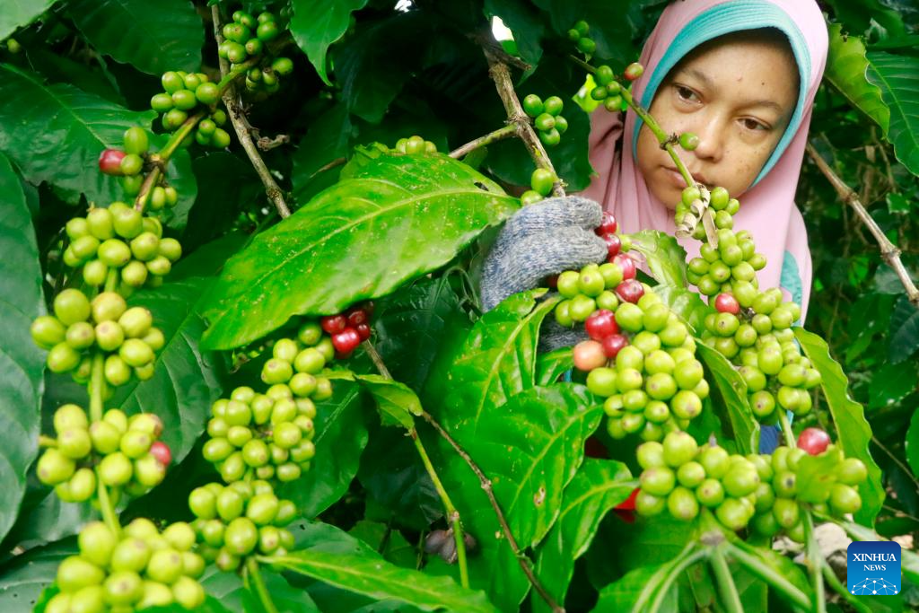 A farmer picks red cherries of robusta coffee beans at a plantation in Bener Meriah regency, Aceh province, Indonesia, on Aug. 24, 2025. (Photo by Yulham/Xinhua)