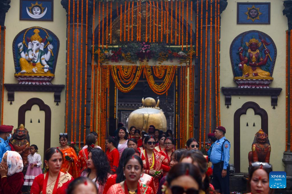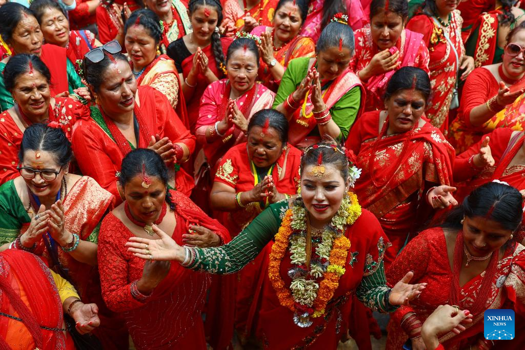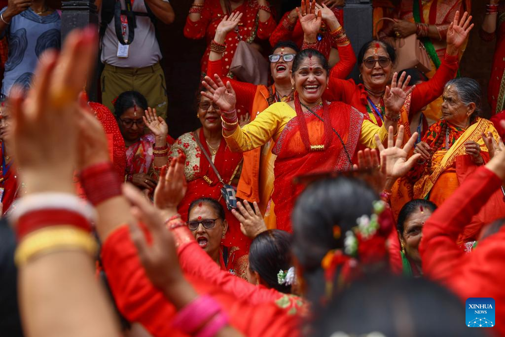 Women celebrate the Teej Festival at the Pashupatinath Temple in Kathmandu, Nepal, Aug. 26, 2025. During the festival, married women fast and pray for good health and longevity of their husbands and unmarried women pray for marrying ideal husbands. (Photo by Sulav Shrestha/Xinhua)