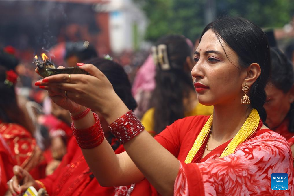 A woman performs a ritual prayer celebrating the Teej Festival at the Pashupatinath Temple in Kathmandu, Nepal, Aug. 26, 2025. During the festival, married women fast and pray for good health and longevity of their husbands and unmarried women pray for marrying ideal husbands. (Photo by Sulav Shrestha/Xinhua)