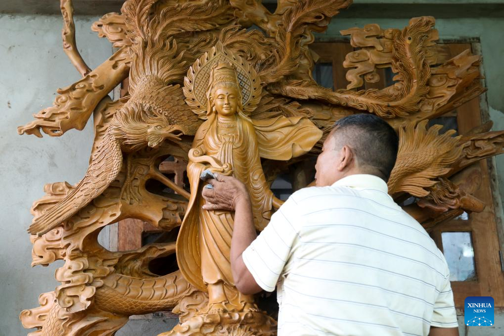 A man works on a piece of wood sculpture in Yangon, Myanmar, Aug. 27, 2025. (Xinhua/Myo Kyaw Soe)