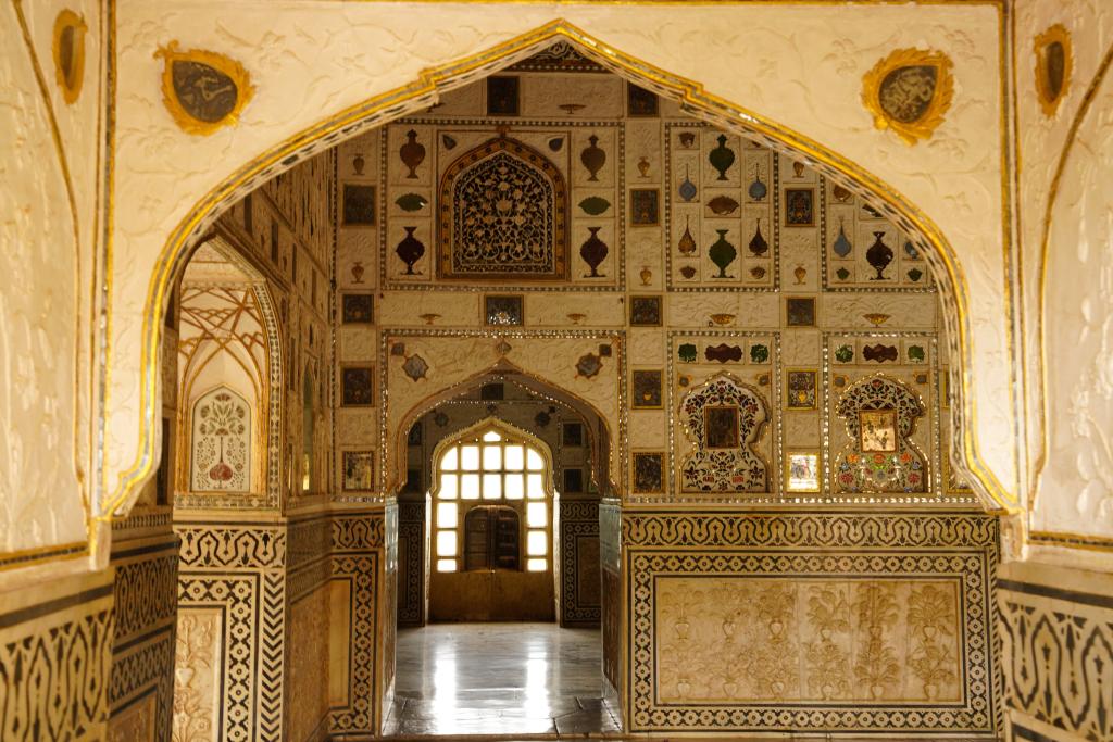 This photo taken on Aug. 5, 2024 shows an interior view of the Amber Fort in Jaipur, India. India boasts a diverse and rich culture, attracting global attention with its historical heritage, Bollywood film industry, yoga culture, and more. (Xinhua/Chen Dongshu)