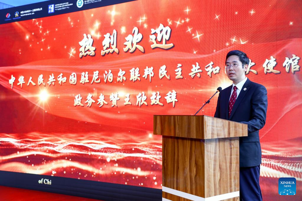 Wang Xin, a counselor at the Chinese Embassy in Nepal, speaks at the opening ceremony of the first center for Chinese language and professional skills in Lalitpur, Nepal, Aug. 28, 2025. The first center for Chinese language and professional skills in Nepal was inaugurated on Thursday in the Kathmandu Valley to cultivate local talents who are proficient in Chinese and master electrical technologies. (Photo by Sulav Shrestha/Xinhua)