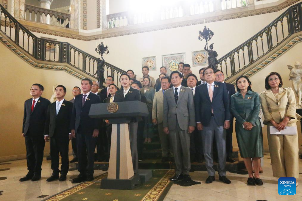 Paetongtarn Shinawatra (front, C) speaks to the press at the government house in Bangkok, Thailand, Aug. 29, 2025. Thailand's Constitutional Court on Friday removed suspended Prime Minister Paetongtarn Shinawatra from office for violating the constitution over her phone conversation on the border issue with Cambodia. (Photo by Rachen Sageamsak/Xinhua)