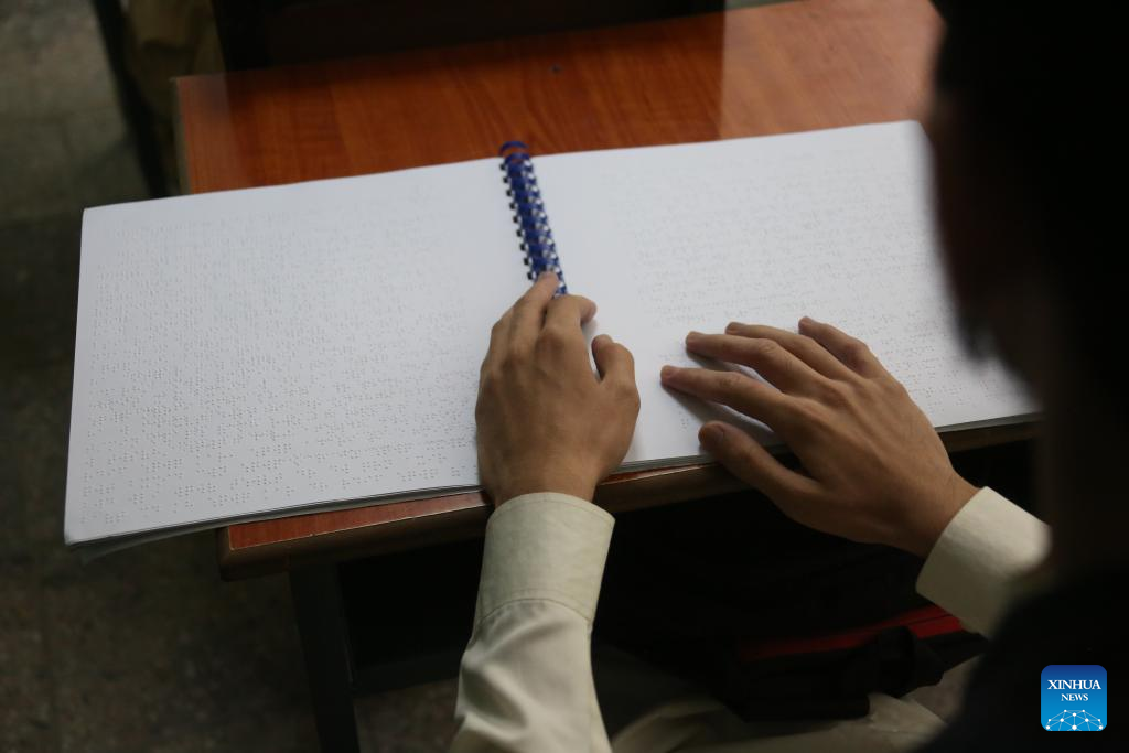 A blind person reads a book at a vocational institute in Kabul, the capital of Afghanistan, on Aug. 24, 2025. (Photo by Saifurahman Safi/Xinhua)